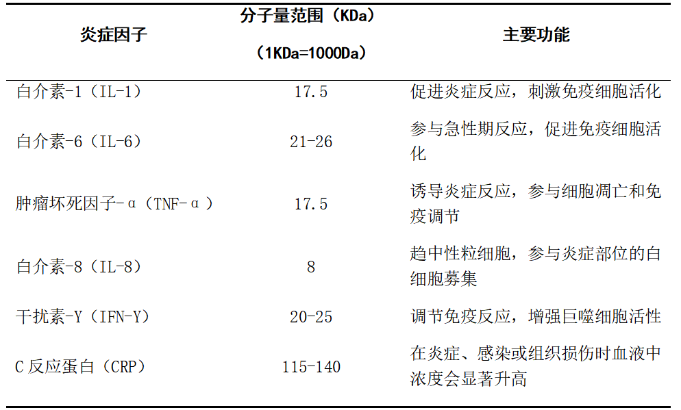 血液透析可以清除小分子毒素(<500Da),如尿素、肌酐等;但對中大分子毒素的清除效果較差。而尿毒癥患者體內引發微炎癥狀態的關鍵物質,多為中大分子毒素,其具體特性如下表所示: